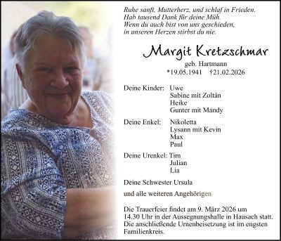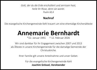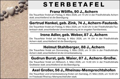 STERBEFELFranz Wölfle, 90 J., AchernDie Trauerfeier findet am Freitag, 6. März 2026, um 14 Uhr in der Friedhofshalle Achern statt; anschließend ist die BeerdigungGertrud Hankel, geb. Zink, 74 J., Achern-Fautenb.Die Trauerfeier findet am Freitag, 6. März