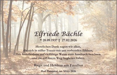 STERBEFELAlfons Maier, 86 J., Achern-SeebachDie Trauerfeier findet am Dienstag, 24. März 2026, um 14 Uhr in der Herz-Jesu-Kirche in Seebach statt; anschließend ist die Beerdigung auf dem Friedhof.
