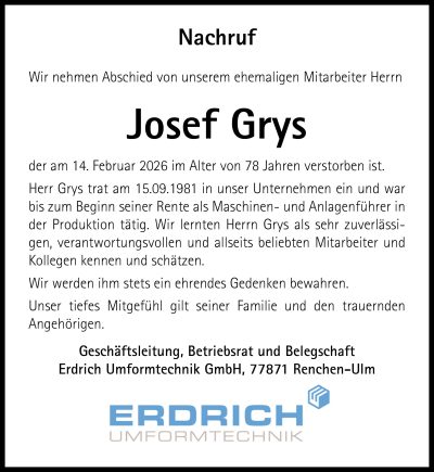 STERBEFELFranz Wölfle, 90 J., AchernDie Trauerfeier findet am Freitag, 6. März 2026, um 14 Uhr in der Friedhofshalle Achern statt; anschließend ist die BeerdigungGertrud Hankel, geb. Zink, 74 J., Achern-Fautenb.Die Trauerfeier findet am Freitag, 6. März